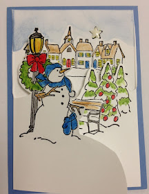 A Try-Fold card "Village" by Art Impressions. This was colored with Derwent Inktense pencils and blended with a Zig Wink of Stella. A star was added to the card. It was hand cut and added to a 4.25 x 5.5. blue card base.