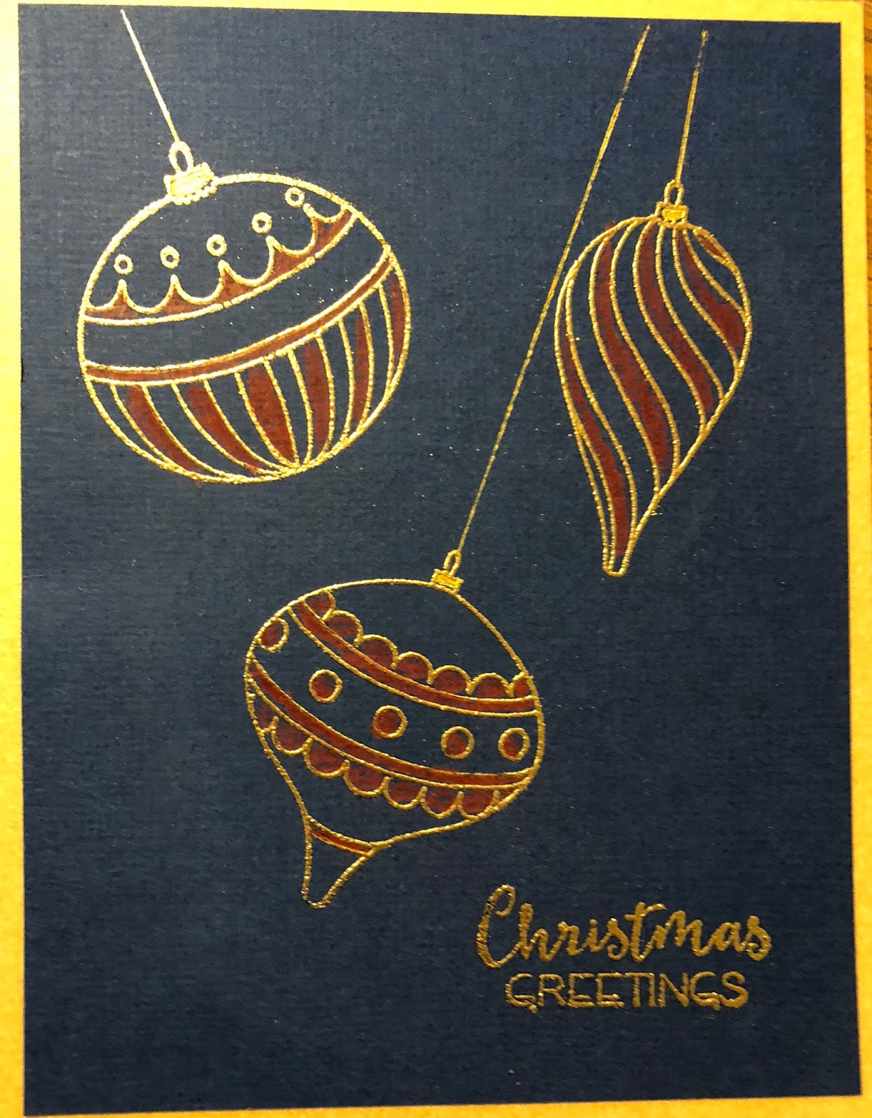 A simple card using a stamp set from Taylored Expressions, navy paper, gold emboss, red Faber Castell pencil. The navy base was mounted on a gold to create a 4.25 x 5.5 card. Hope you enjoy!