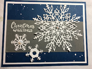 White splatters on navy with a gray band for a white embossed greeting. The snowflakes are from two different releases from Sizzix. Hope you enjoy!